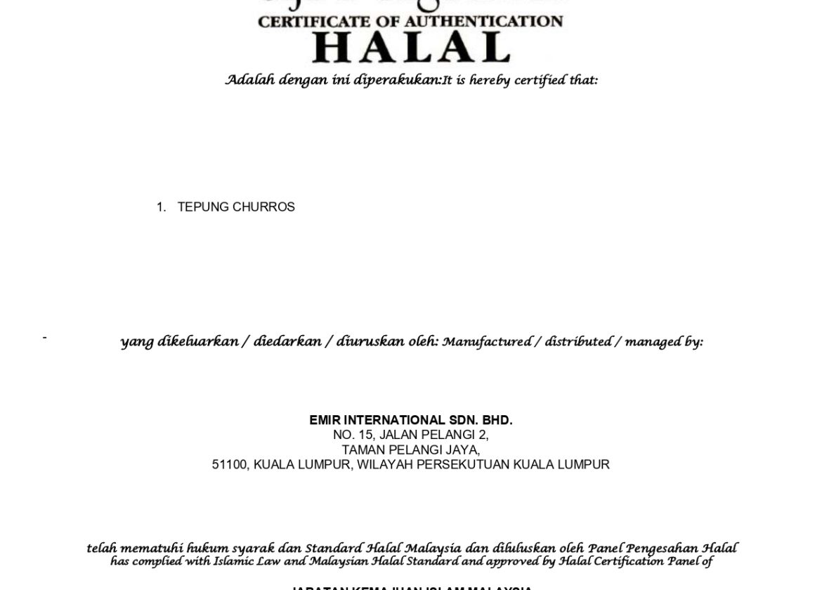 Alhamdulillah, Tepung Churros kami kini rasmi mendapat sijil HALAL.Dengan pengiktirafan ini, anda boleh menikmati churros yang rangup, lazat dan diyakini bersih serta selamat.